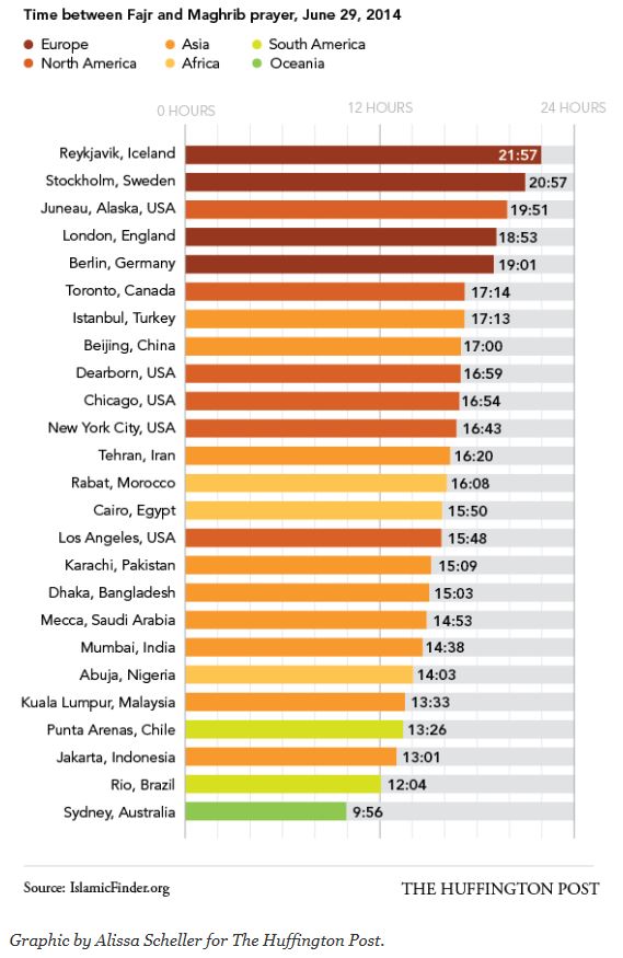 differences in the length of the daily fast during Ramadan at the end of June depending on one's location.